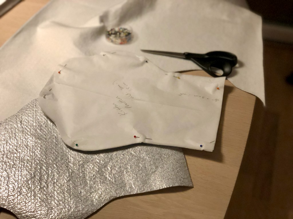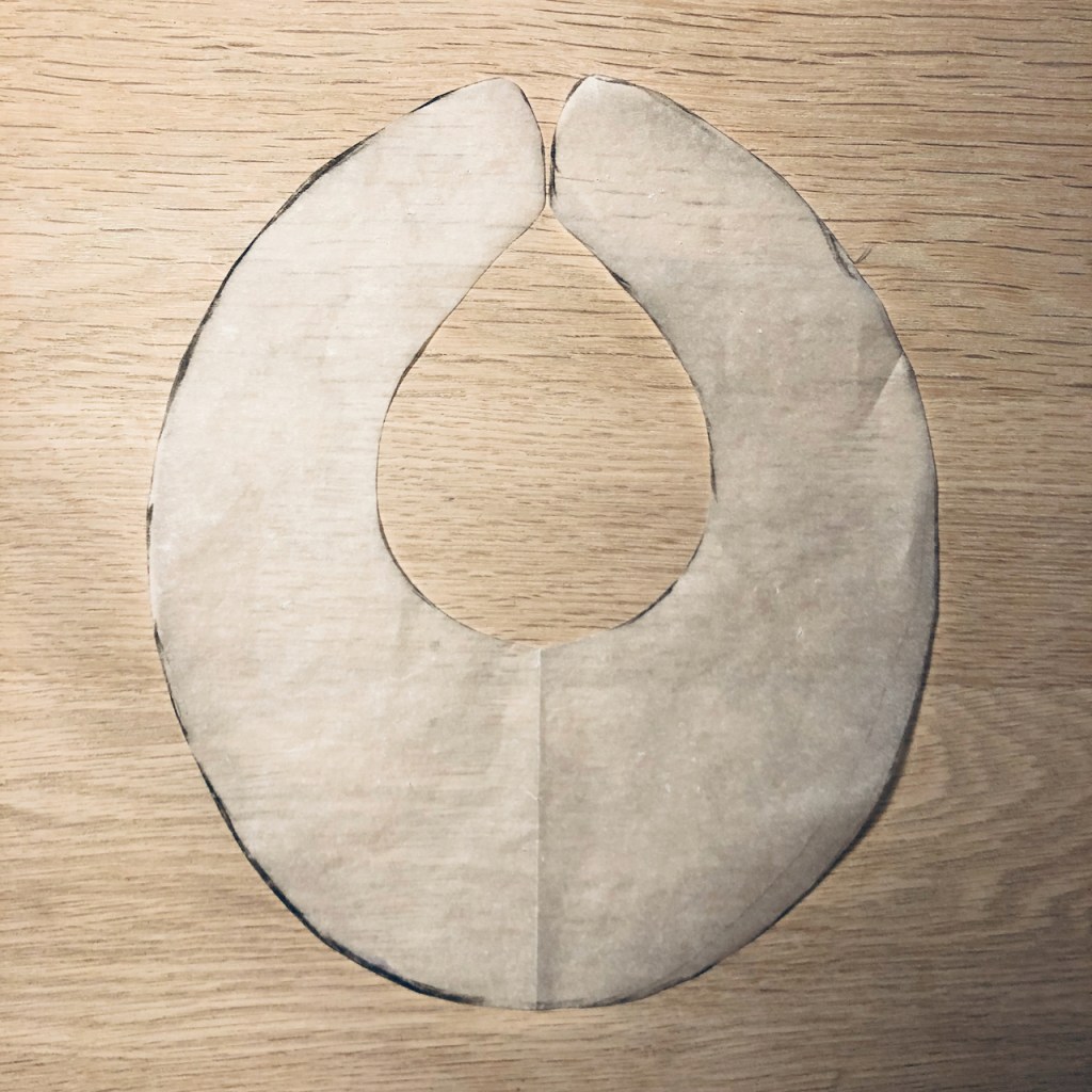 Hvis du vil lage en selv, bør du først lage en mal. Jeg tegnet rundt en smekke jeg hadde fra før, og justerte der jeg syntes det trengtes. Jeg ville for eksempel ikke ha den spiss foran. Malen tegnet jeg på bakepapir, men du kan like gjerne bruke vanlig kopipapir. Jeg anbefaler å brette både papir og smekke dobbelt før du tegner, så du er sikker på at malen blir symmetrisk.