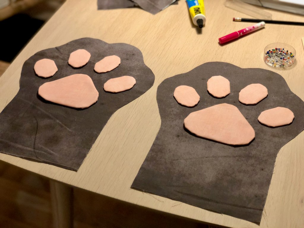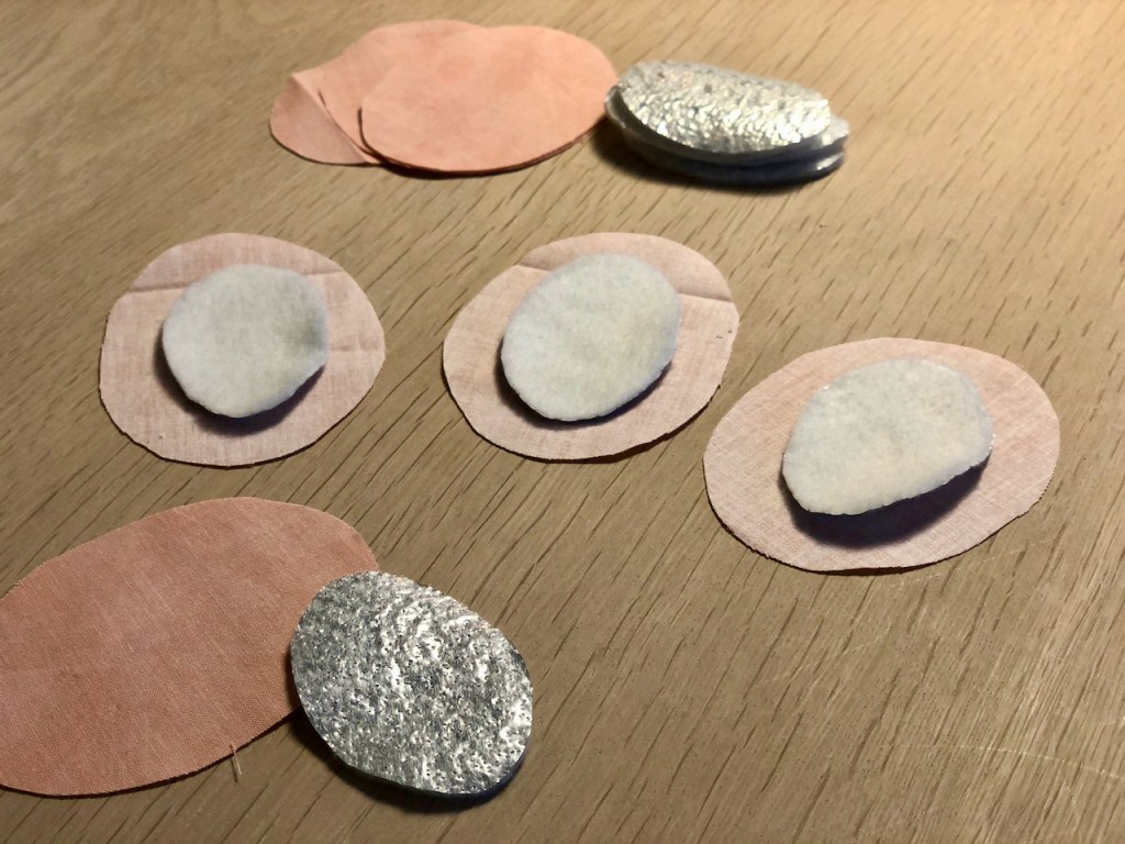 Før du syr alle vottedelene sammen, skal du dekorere to av de grå delene med rosa potelapper (i mangel av et bedre ord). Klipp først ut passende store lapper i bomullsvatt, og bruk disse som mal for å klippe ut litt større lapper av det rosa stoffet. Du skal totalt ha fire små og én litt større potelapp for hver vott.