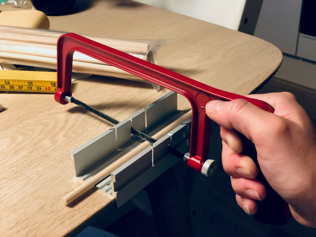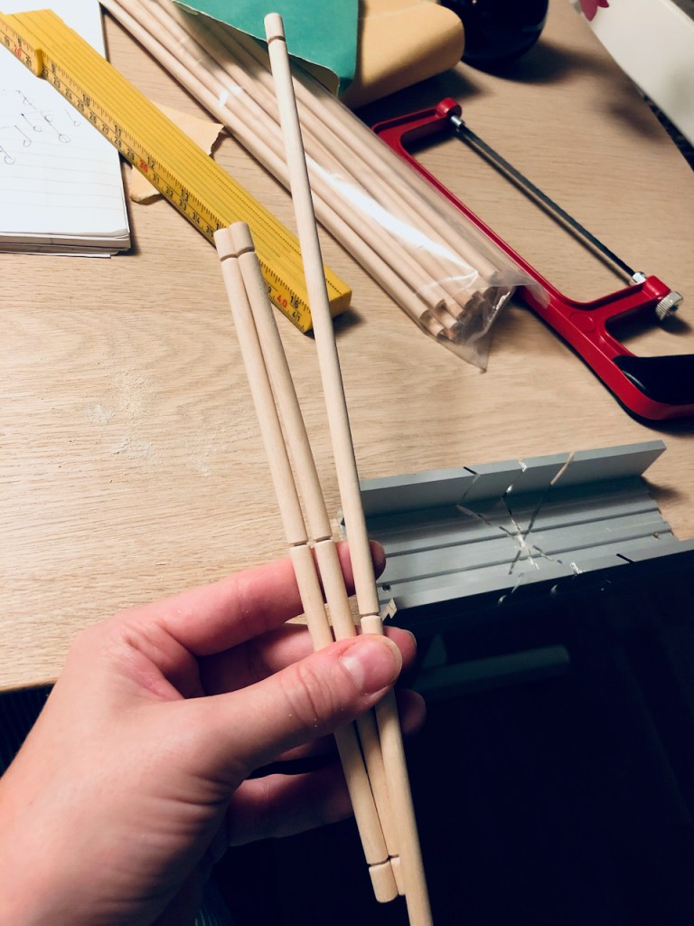 Deretter kapper du pinnene til ønsket lengde. De som skal henge like høyt bør være like lange, så de blir like tunge (jeg snakker av erfaring).