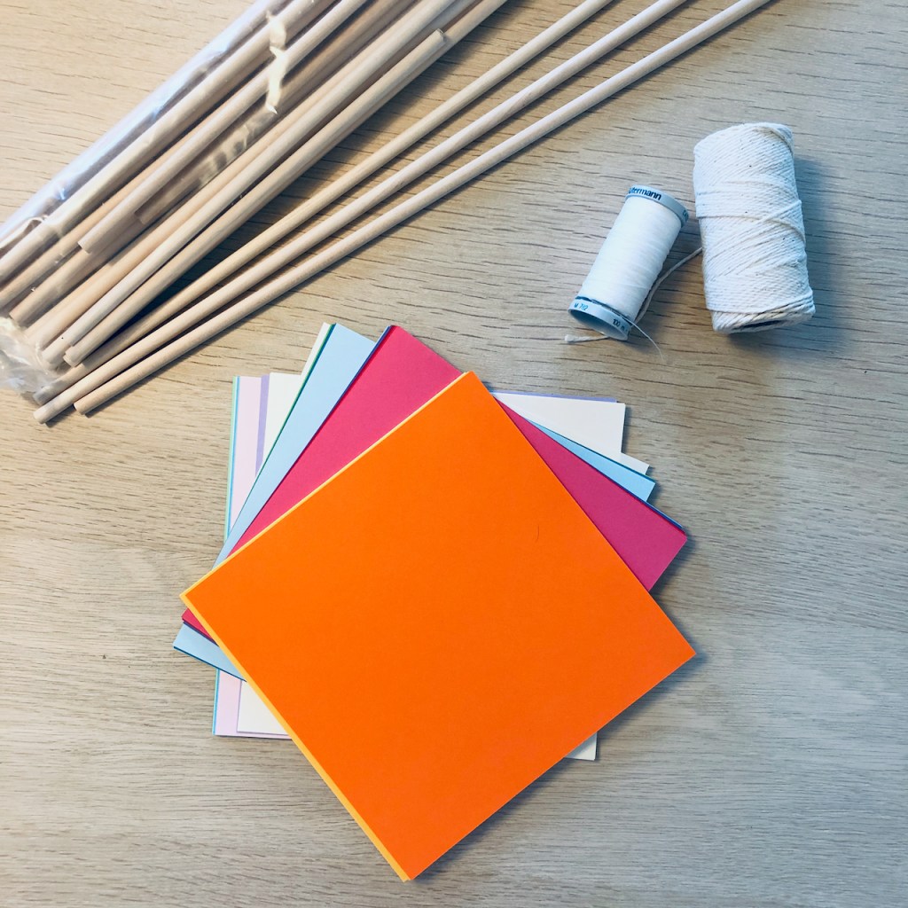 Det du trenger for å lage denne uroen er: blomsterpinner, origamipapir, hyssing (evt bånd) og en sterk sytråd. Og utstyr for å måle og kappe med da.