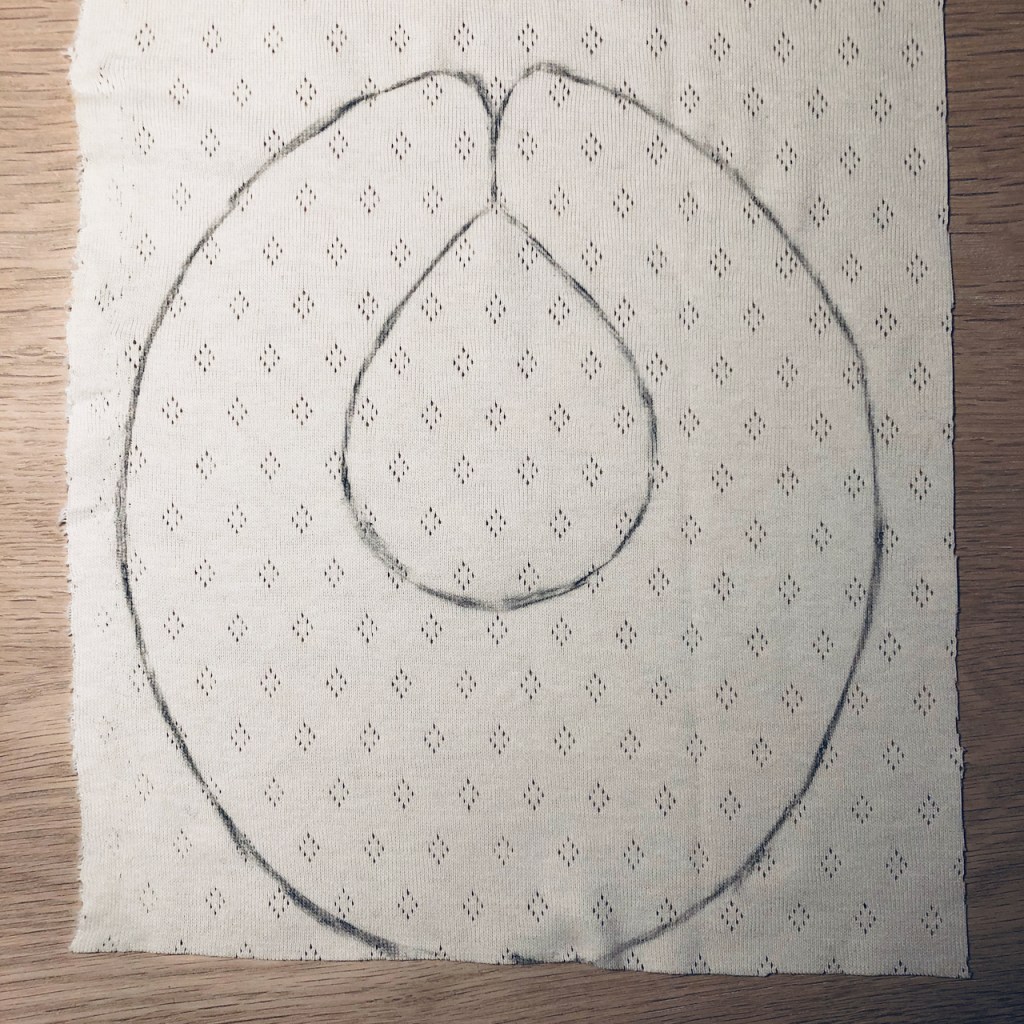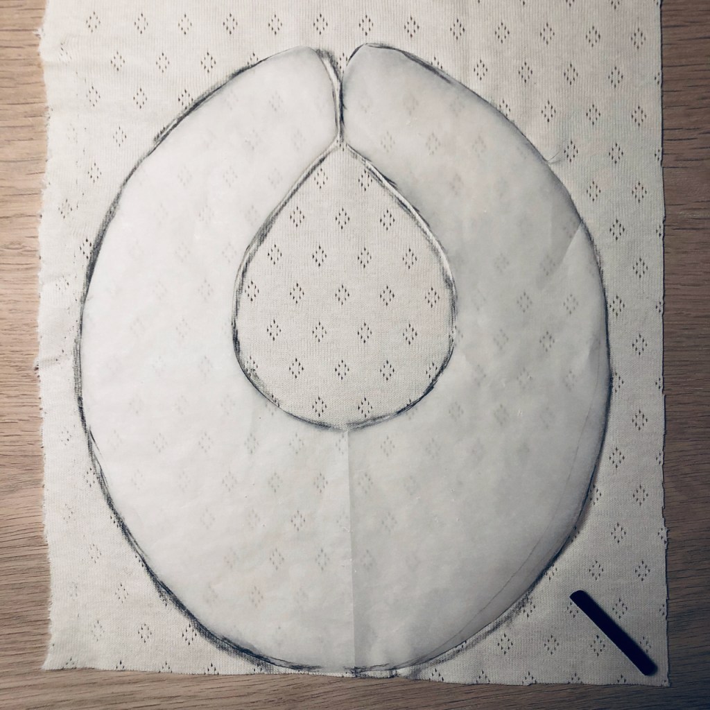 Når malen er klar, legger du den på det stoffet du ønsker å bruke, og tegner rundt. Pass på at bretten på malen ligger parallelt med mønsteret (evt trådretningen) i stoffet. Hvis du, som jeg, velger å bruke et lyst og elastisk stoff, er kullstift et perfekt verktøy å bruke. Så lenge du klipper innenfor streken, så klart. Du kan med fordel tegne på baksiden av stoffet, så er du sikker på at streken ikke blir synlig på den ferdige smekken.