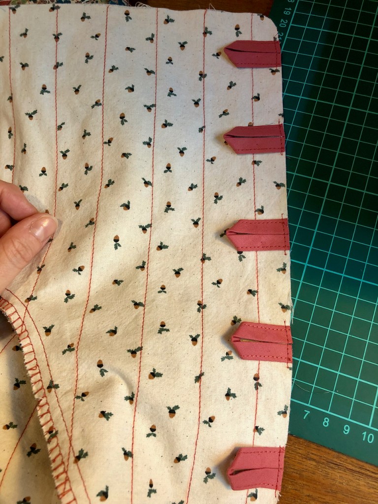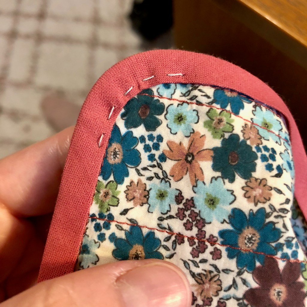 Tips: Det kan hjelpe å lime lappene fast med tekstillim før du syr, så det rosa stoffet holder seg på plass.