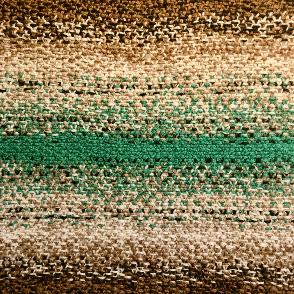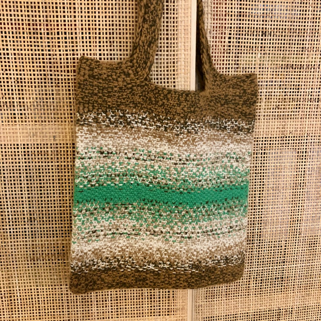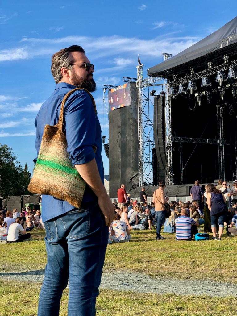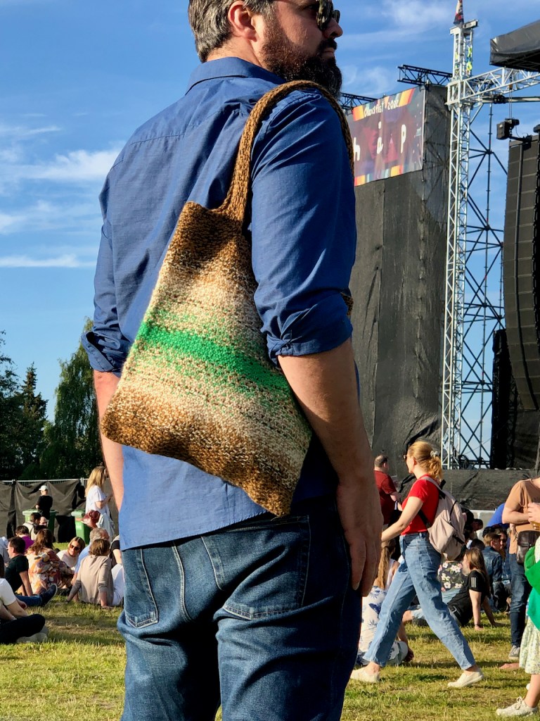 Denne tote bagen ble strikket til min gode venn Jørunds bursdag allerede i januar, men ble ikke avbildet med mottaker før nå i sommer. Derfor litt sent skryteinnlegg. Ingen prosessbilder denne gangen, kun bilder av resultatet. Men jeg kjenner at jeg må strikke en til meg selv også, når tid og krefter tillater det, og da skal jeg prøve å få tatt noen flere brukbare bilder underveis. Oppskriften er fra vår alles kjære PetiteKnit, så klart, og kan bestilles her. Garn: trippel(!) tråd Double Sunday fra Sandnes Garn, i fargene 2511 Almond, 2542 Camel, 2543 Brunt Sukker, 9882 Into the Woods og 8236 Statement Green.