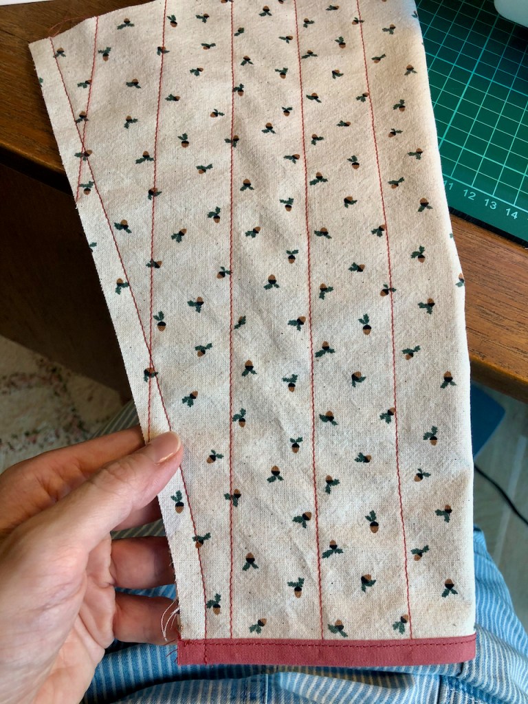 Og så er det bare å sy alle delene sammen, rett mot rett, med fôret ytterst. Vreng og sy inn kanten nederst. Du kan evt sy på en liten hempe til å henge opp vottene.
