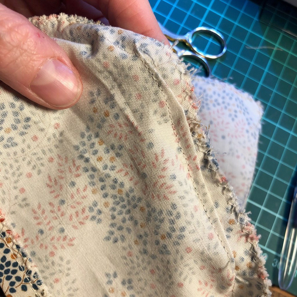 Og så er det bare å velge ut stoff som kan passe som lapper. Mitt valg falt på noen søte små stoffrester fra en quiltet jakke og en julekjole jeg sydde i fjor. Litt av poenget med å lappe klær, er jo å spare penger og miljø, så da er det bare dumt å kjøpe nytt stoff til å lappe med. Dessuten er det jo hyggelig å kunne bruke opp stoff man har til overs.