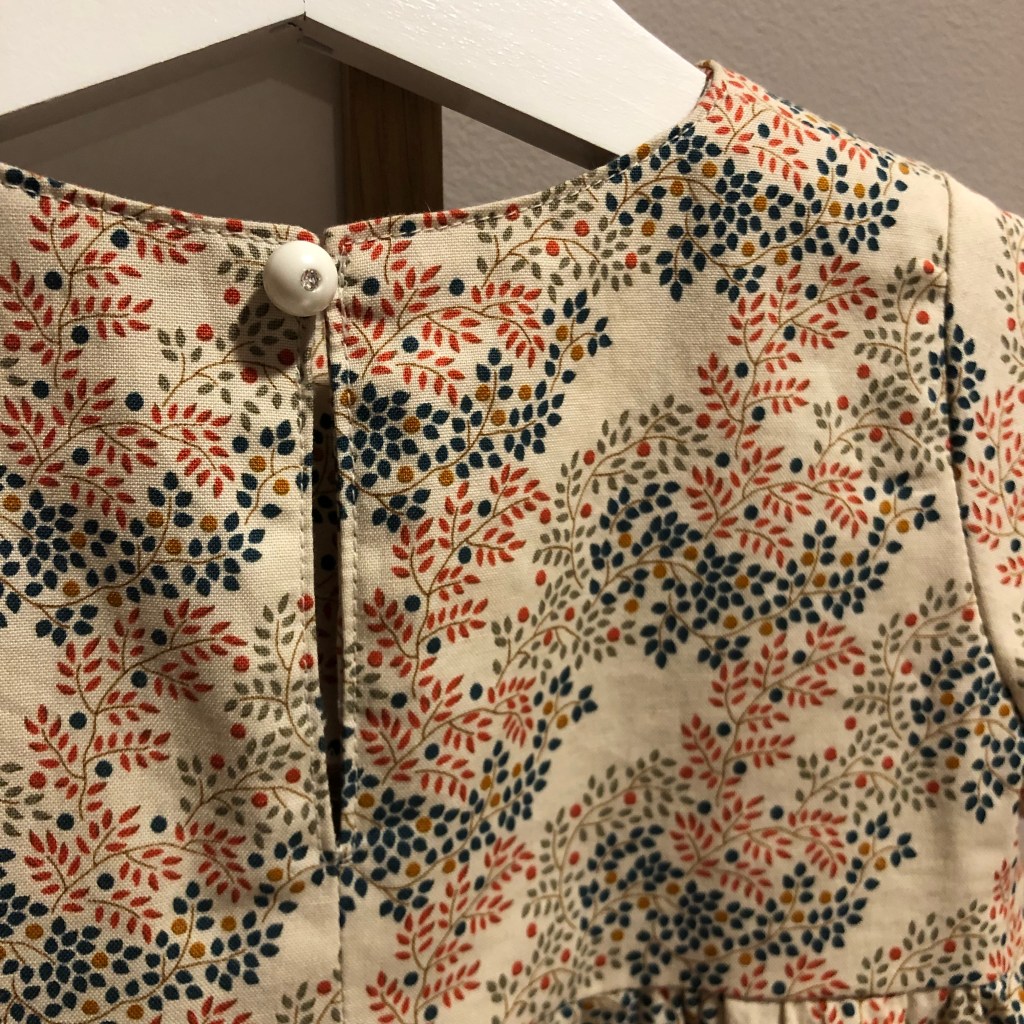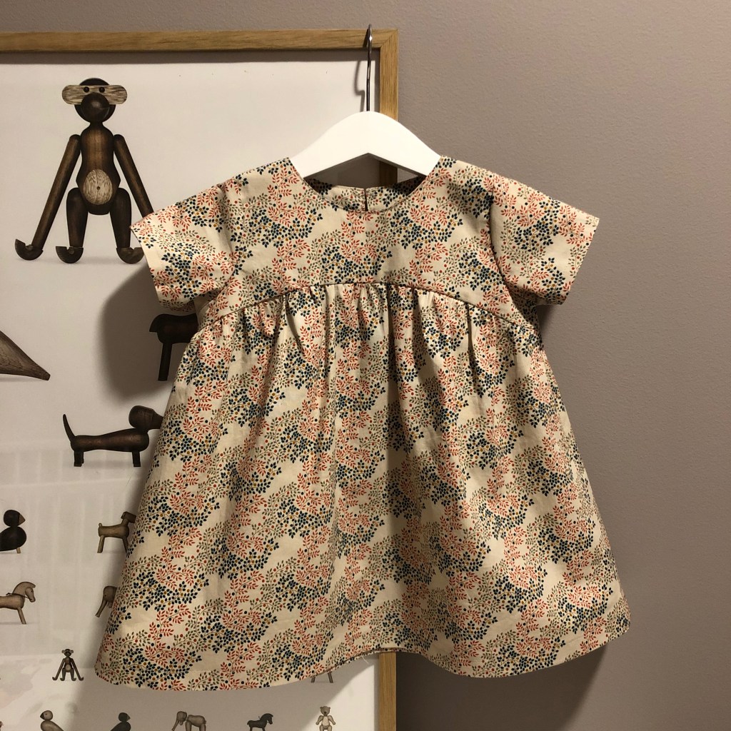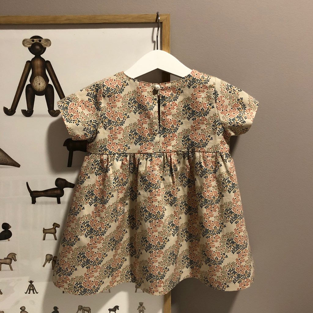 Både mønster (fra Minikrea) og stoff fant jeg hos Abby’s Tekstiler, og den vakre lille knappen i nakken, er fra M. Sommer. Begge butikker ligger i Trondheim sentrum.