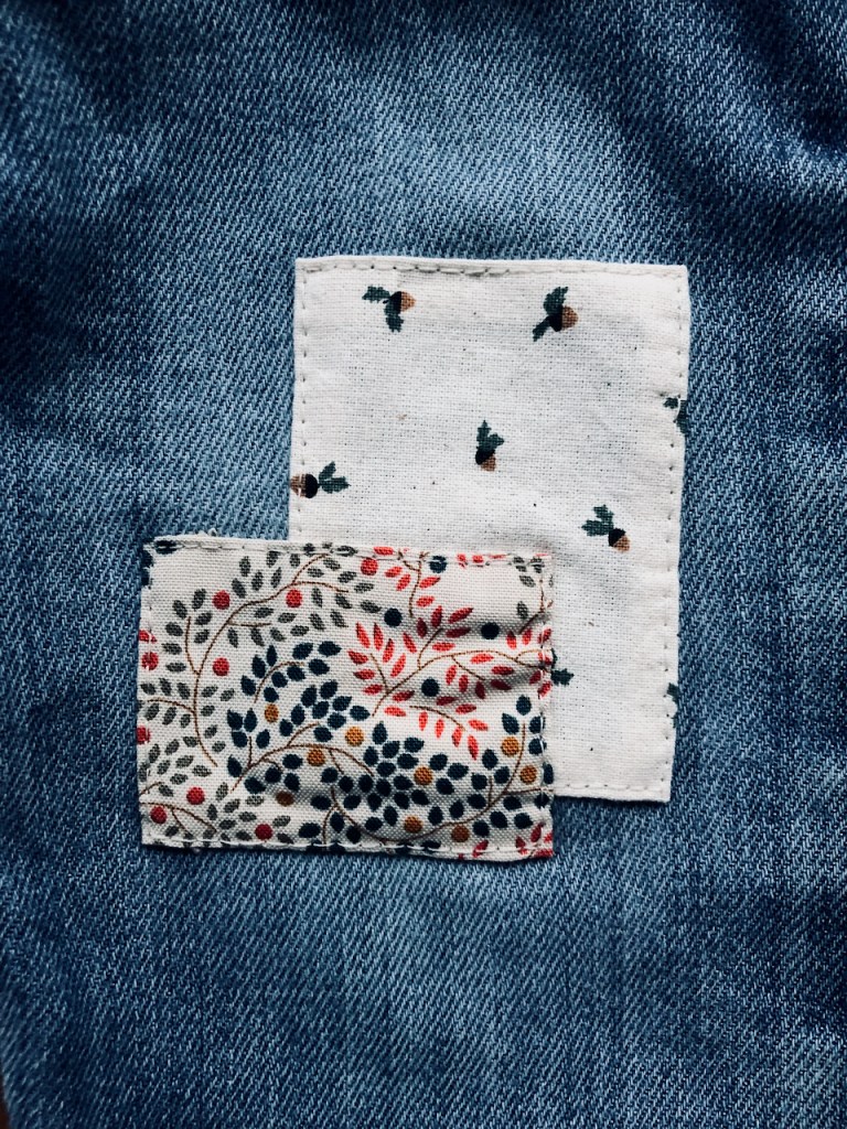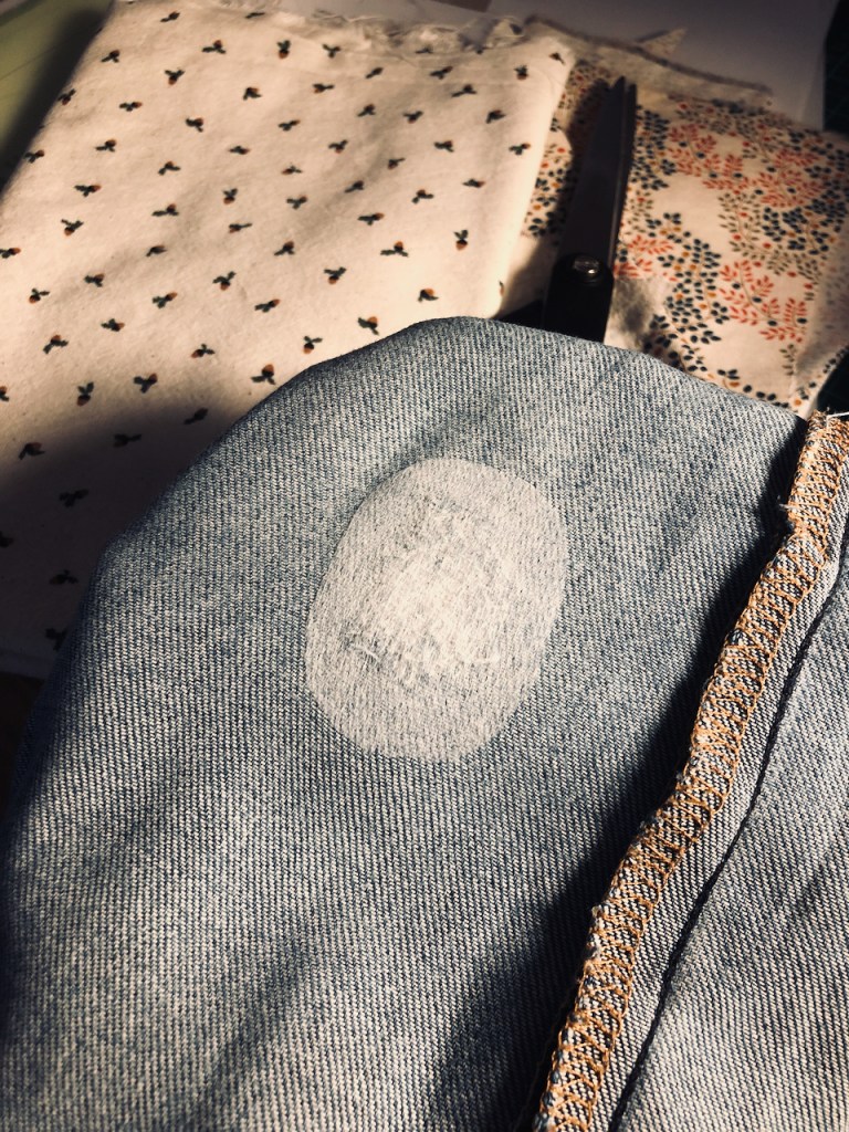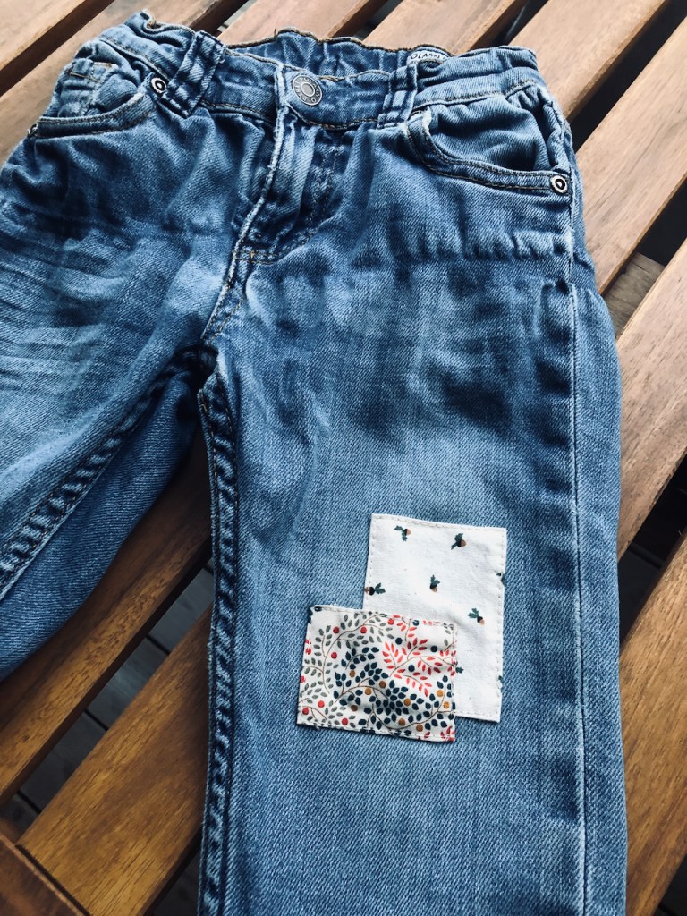 Jeg fikk denne ideen fra et dansk interiørmagasin, hvor noen hadde dekorert jeans med patchwork. Og det var overraskende kult! Så da datteren min tryna i barnehagen og fikk hull på buksa (og hakk i tanna), tenkte jeg det var en gylden mulighet til å teste ut denne trenden.