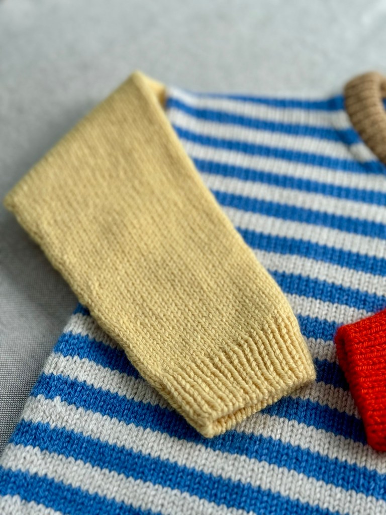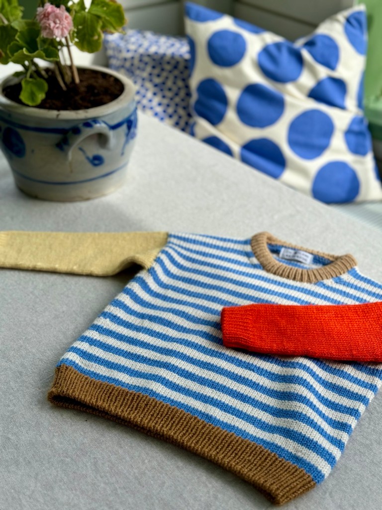 Det røde ermet og de to brunfargene, var restegarn jeg hadde liggende. De andre fargene ble innkjøpt for anledningen. Alt er strikket i Double Sunday fra Sandnes Garn.