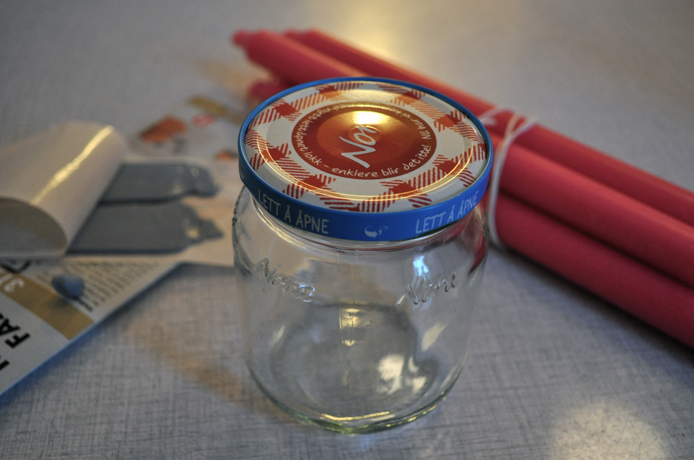 • 1 litt større syltetøyglass (til å smelte lysene i)