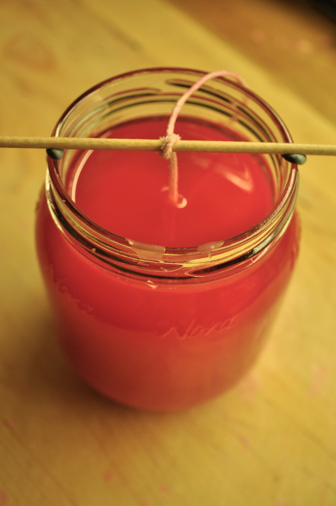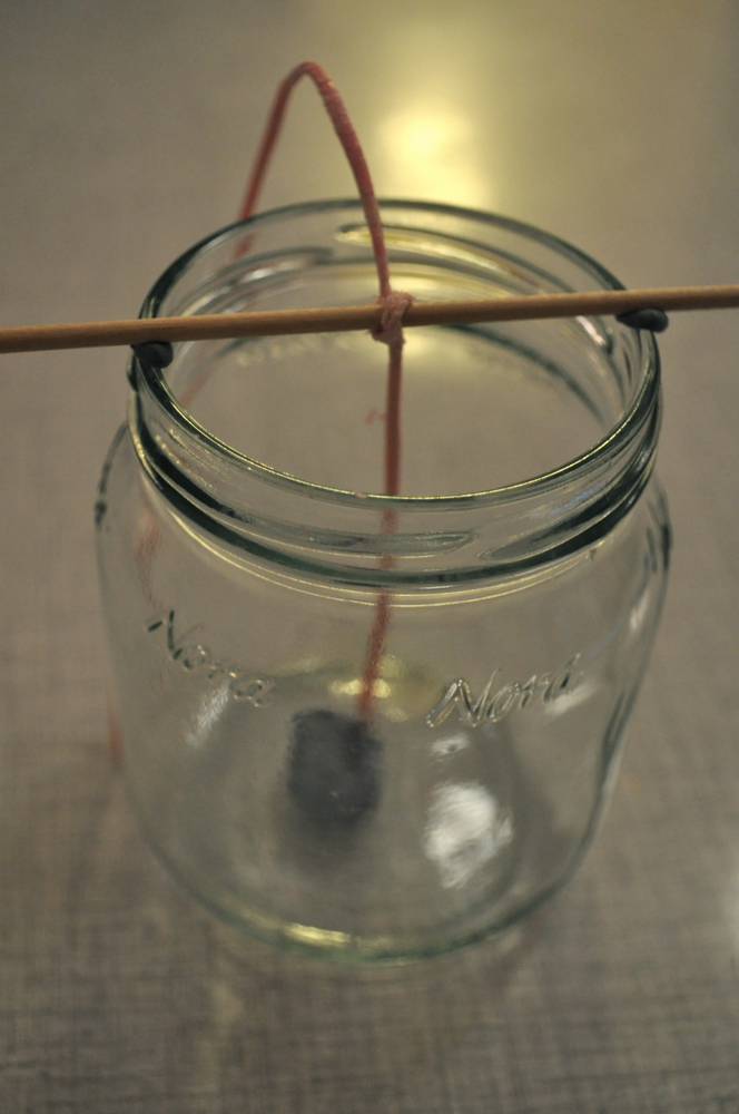 Deretter fester du toppen av veken til en pinne som du legger over glasset. Jeg festet pinnen også med litt leire for at den skulle holde seg på plass.