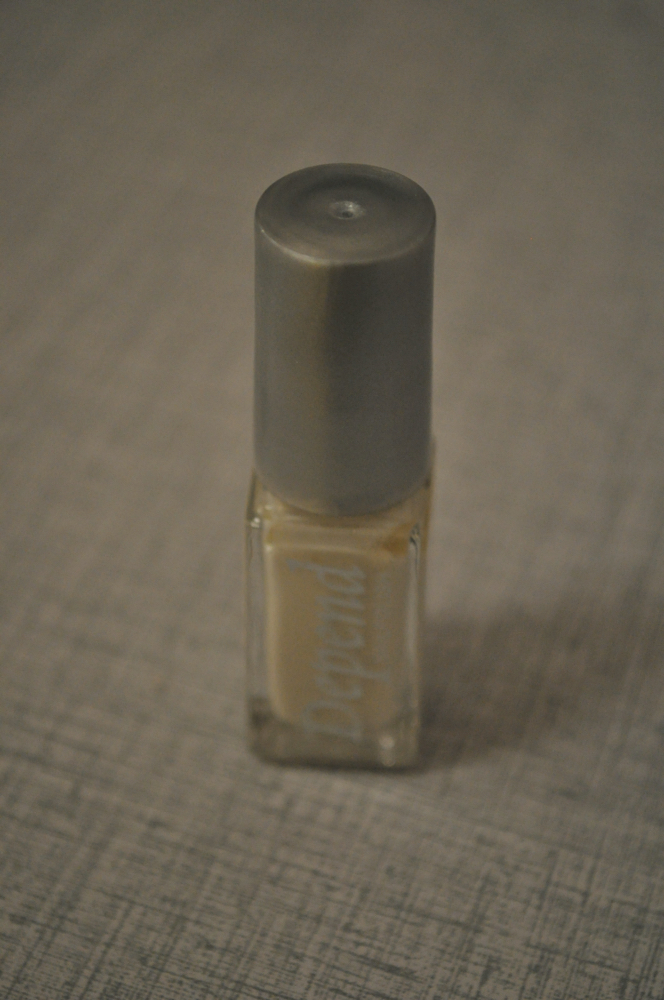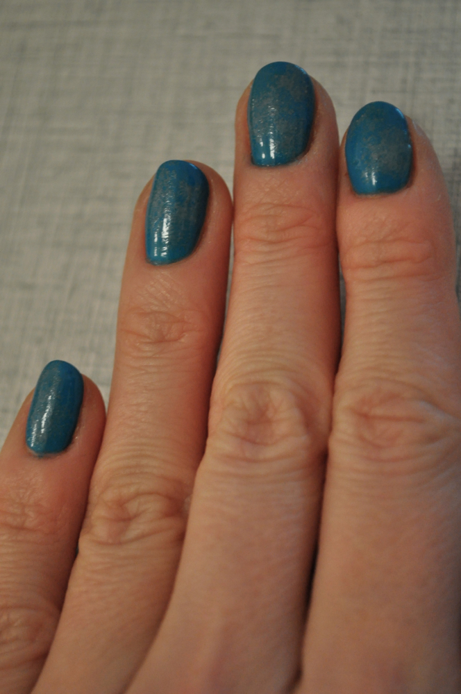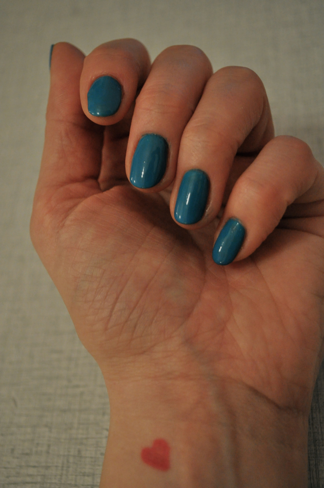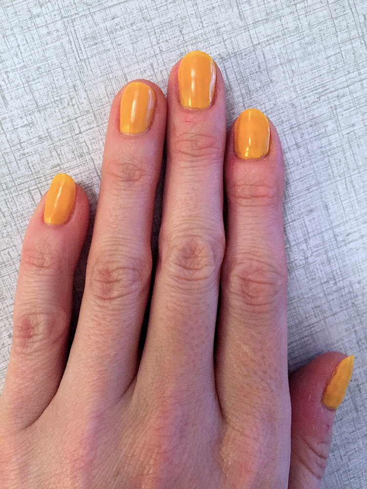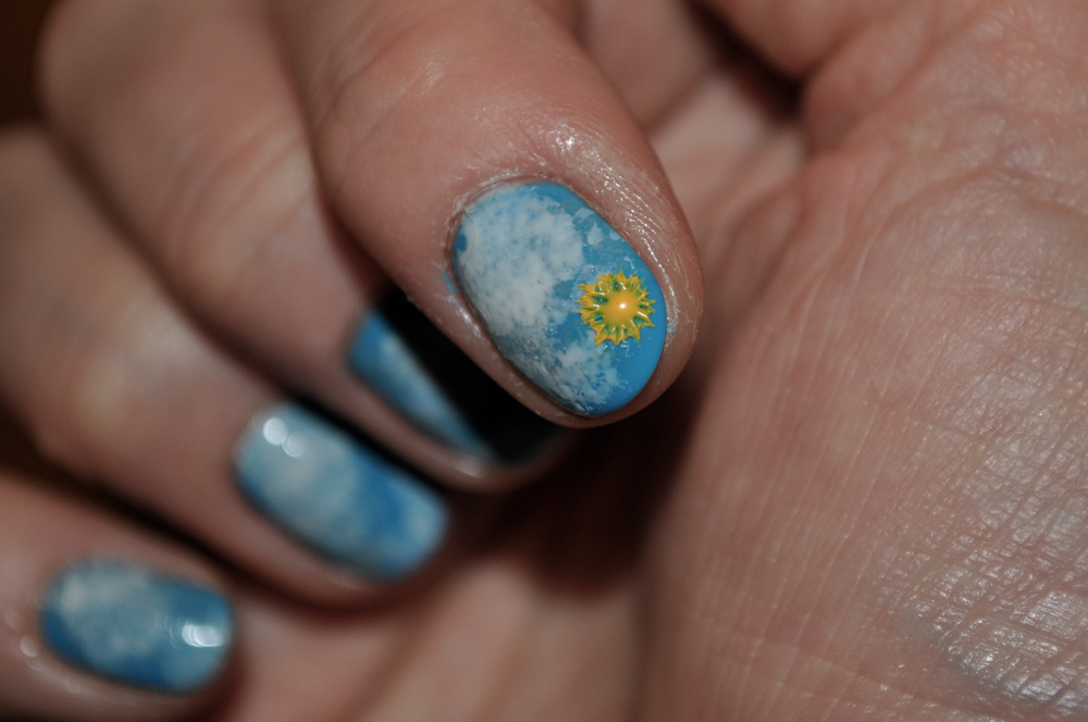 Jeg kunne ha stoppet her. Da ville designet vært enkelt. Men jeg tenkte at det ville være gøy med en liten overraskelse på den ene neglen, nemlig en sol! Dette kom jeg på litt sent, og den eneste flekken med blått som var ledig, befant seg på høyre hånd. Altså, jeg måtte lage solen med venstre. Jeg er høyrehendt. Uansett, det nærmeste jeg kom en solfarge i samlingen var Apotek1-lakken Ruby slippers, i fargen Cheesum(???).