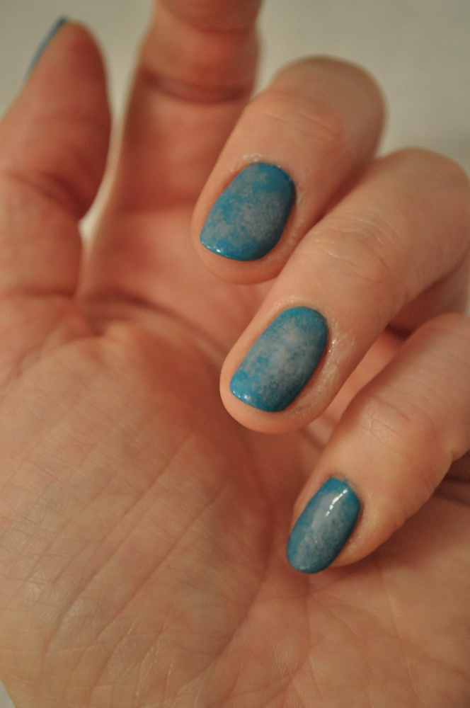 Og så er det tid for det hvite. Nå kan du rive av en litt mindre svampebit, for å få litt mer detaljerte flekker. Hvitt er det sjelden jeg bruker, så jeg kjøpte den billigste lakken jeg fant, nemlig Depend. Navn ukjent. Vi kan kalle den Cloudy white.