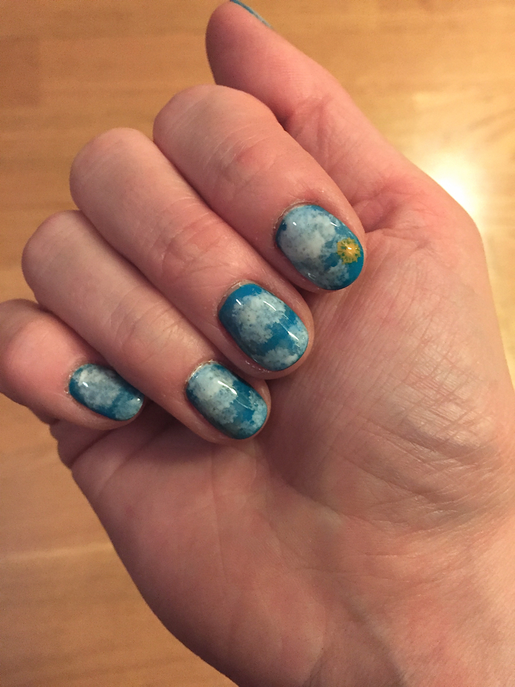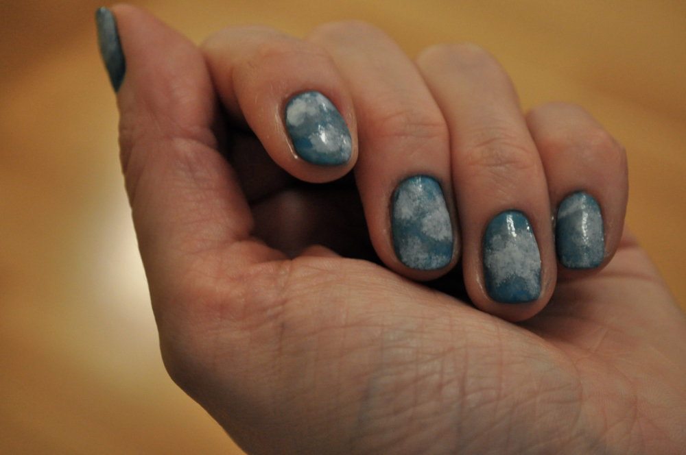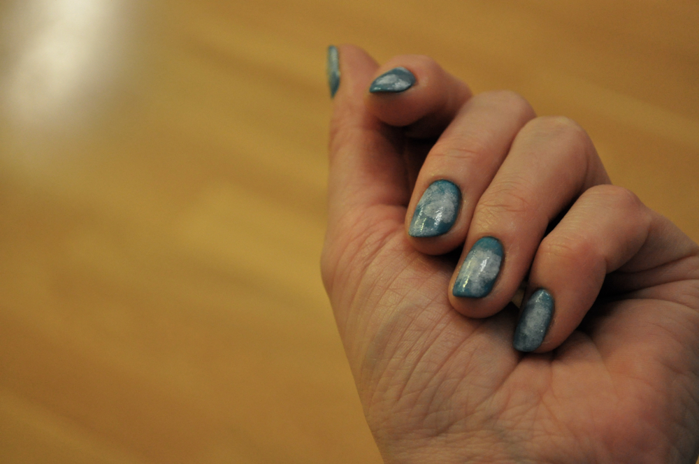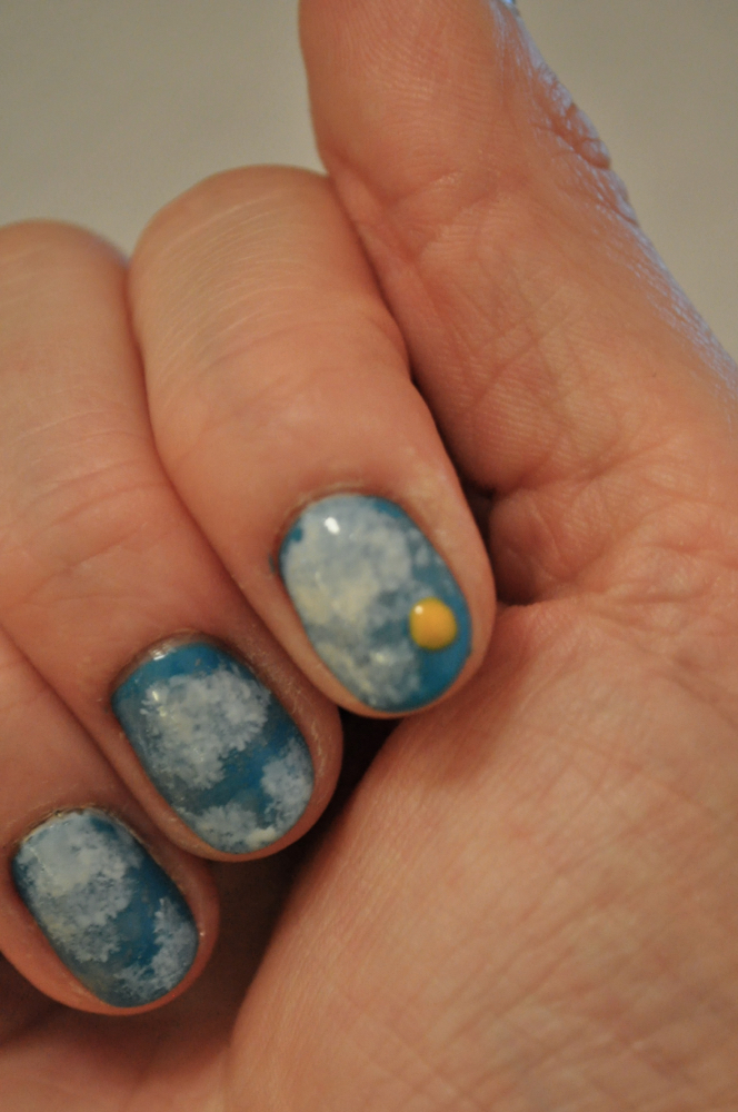 Dette er en manikyr som kan gjøres veldig enkelt, eller litt mer komplisert. Jeg gikk for den siste varianten, og dere får selv vurdere om det var med hell. Dette er i alle fall min måte å lage himmel-negler på: