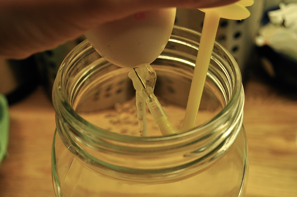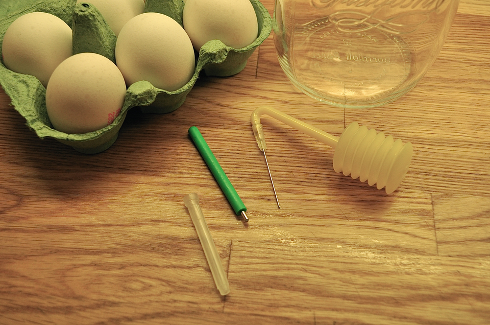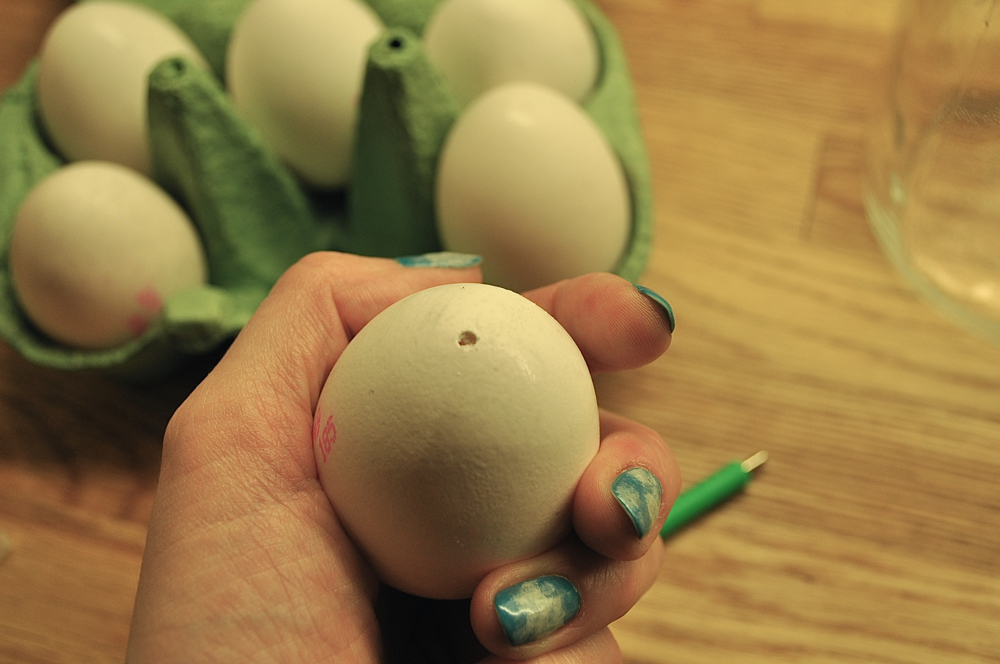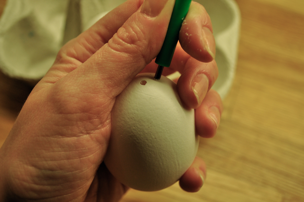 Jeg begynte dette vågale prosjektet med å lage ytterligere to hull i det ene eggeskallet (se hvordan her), for jeg har sett at det skal være sånn. Selv om jeg aldri helt har skjønt hvorfor. Eller hvilken som skal ha hva.