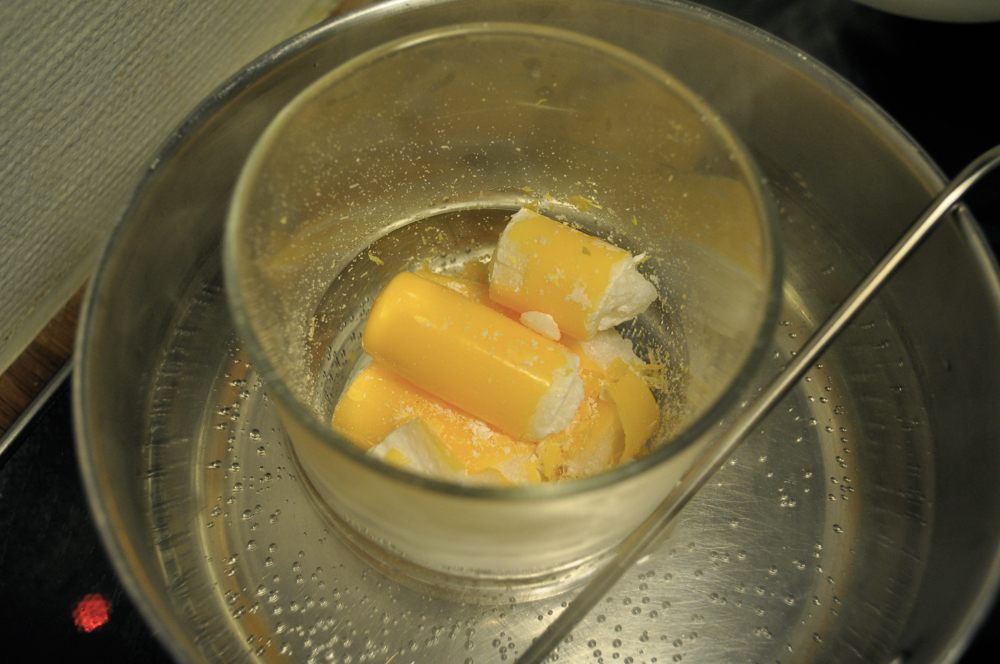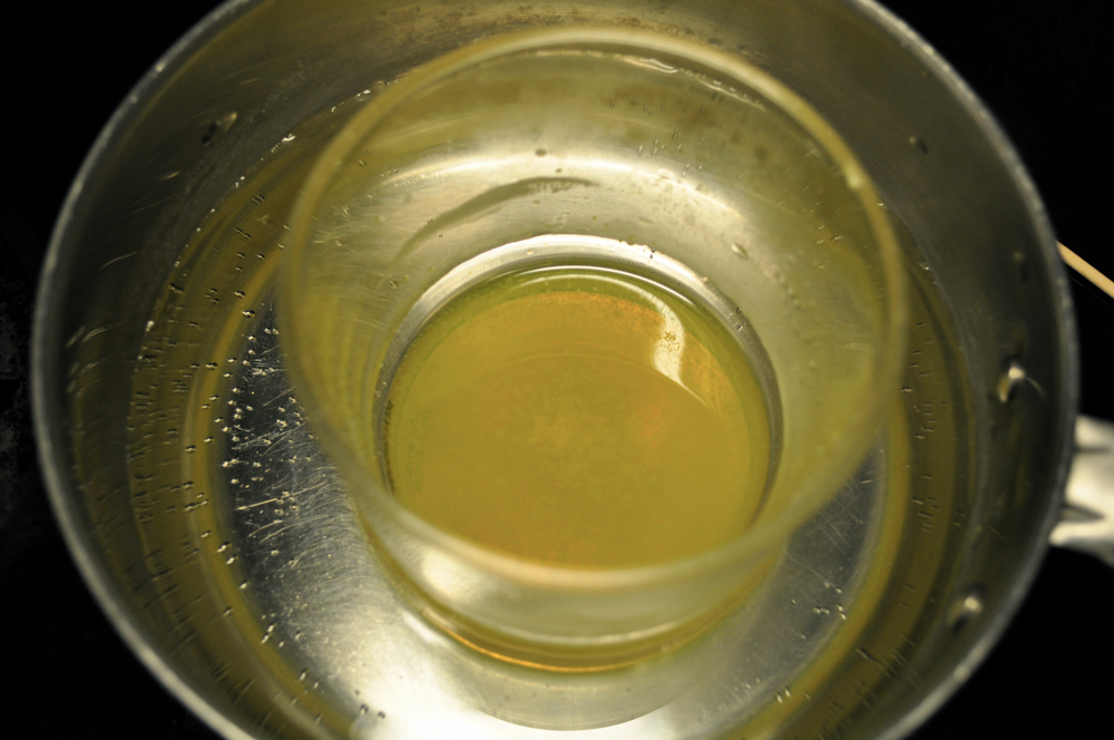 Så skal du smelte sterinlysbitene i vannbad som holder ca 85 grader celsius.