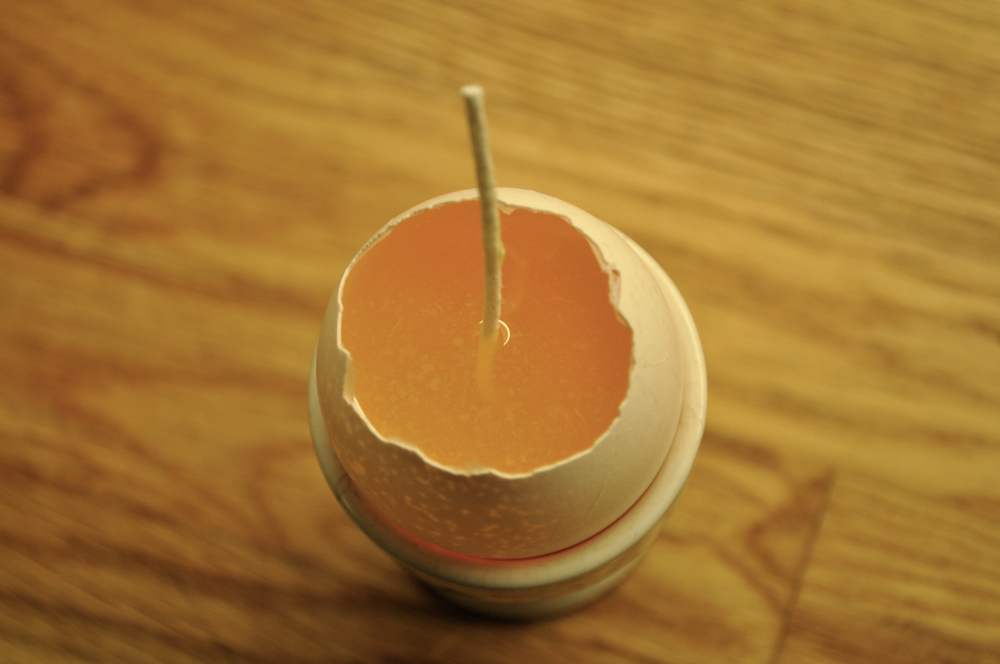 Når stearinen har smeltet heller du den over i eggeskallet. Og så er det bare å vente til det stivner. Er du utålmodig kan du sette det i kjøleskapet for å fremskynde prosessen.