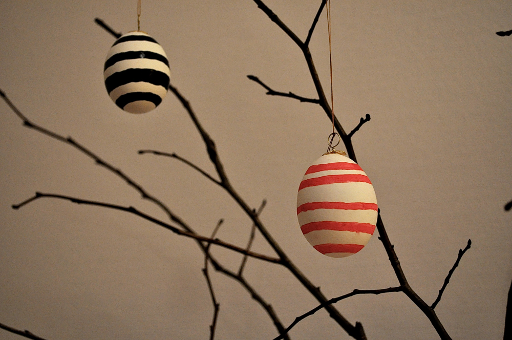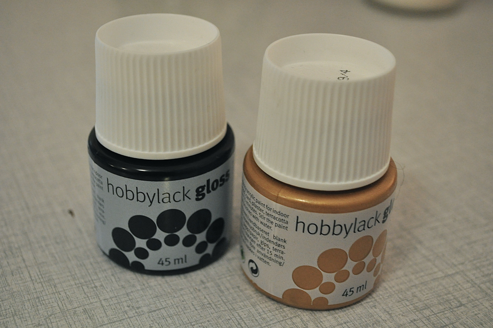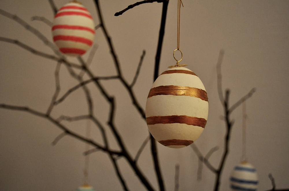 Jeg brukte vanlig vannmaling på det blå, røde og grønne egget. Til det svarte og kobberfargede brukte jeg hobbylakk, for et mindre transparent resultat. Dette for at stripene skulle ligne mest mulig på Kähler sine.