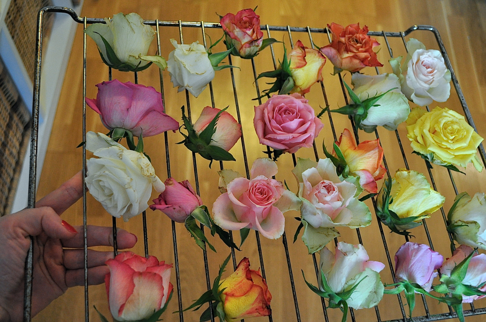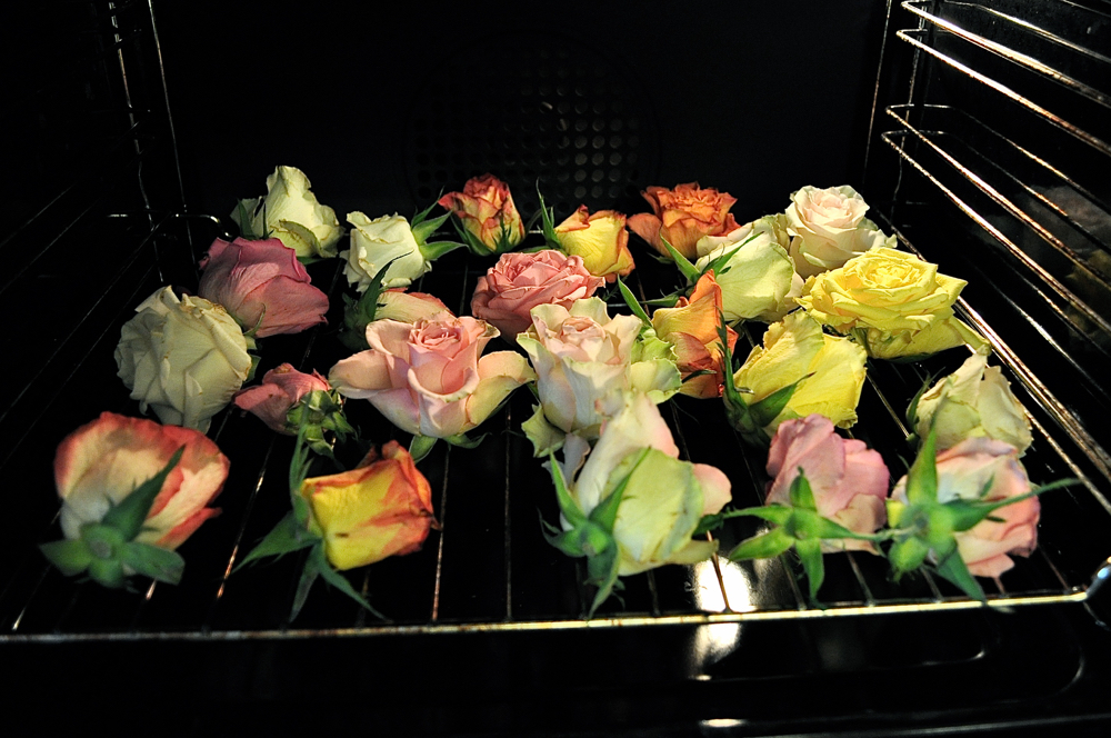 Etter at rosene hadde blitt tørre nok til at kronbladene begynte å falle fra hverandre, «demonterte» jeg dem, og la dem inn i ovnen på nytt for å tørke dem grundig sammen med to vaniljestenger jeg hadde liggende (som hadde gått ut på dato).