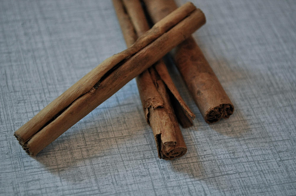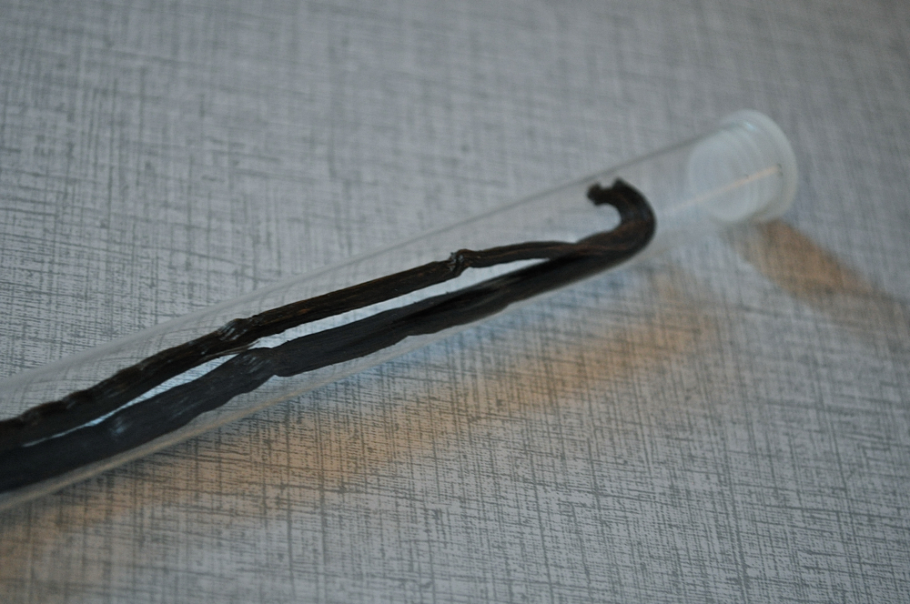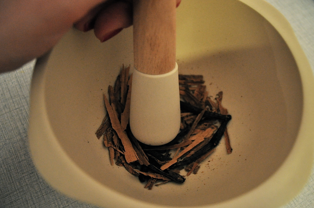 Da alt hadde tørket, knuste jeg vaniljestengene sammen med en kanelstang i morter.