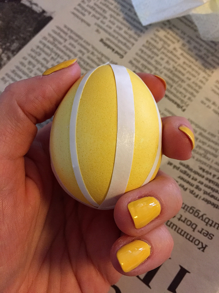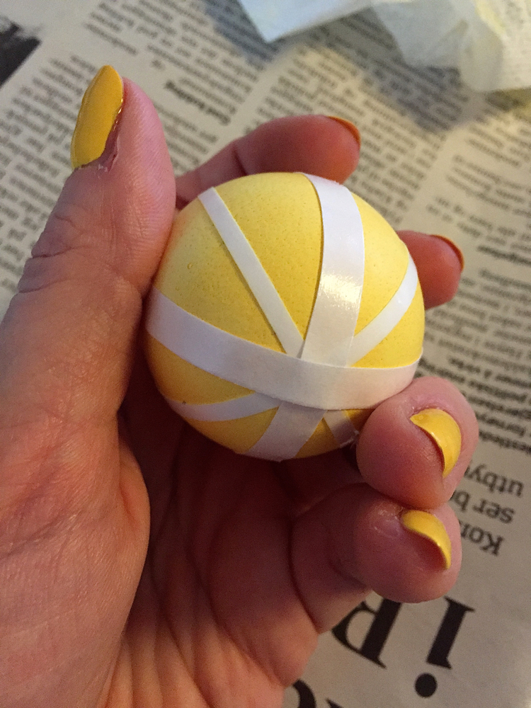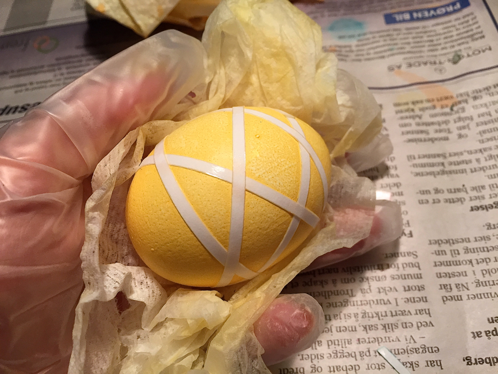 Jeg startet med en runde smal teip i kryss rundt det første egget, og dyppet det deretter i gul farge. Lurt å starte med den lyseste fargen og farge mørkere og mørkere. Av naturlige årsaker.