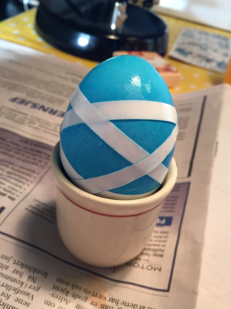 Enda et tips: Tett igjen hullet du har pumpet ut fra før du dypper egget i fargebad, for å unngå et egg fullt av fargebad. Se hvordan du tømmer egget her. Etter første bad var det på med mer teip. Litt bredere teip denne gang.