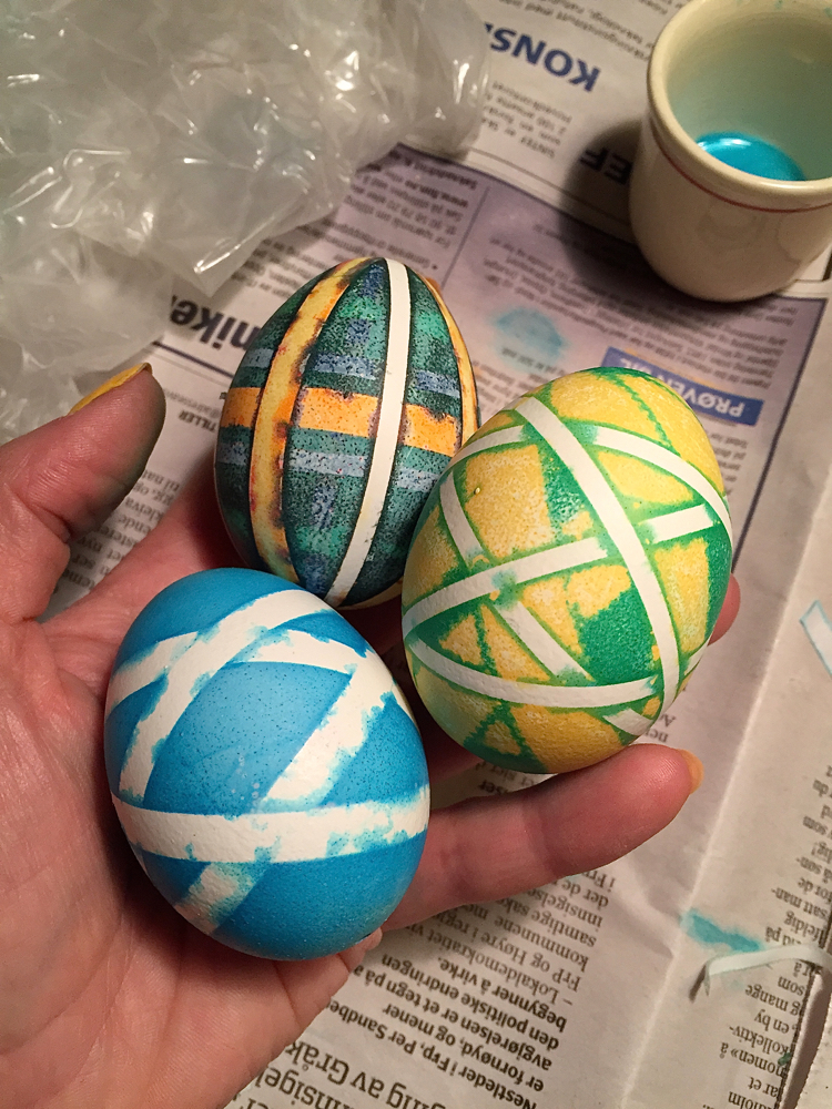 Altså, jeg kan ikke få sagt det tydelig nok: dette var ren og skjær forskning. Jeg måtte le av resultatet, og jeg ville aldri ha dekorert noe som helst med disse eggene, men de har på et eller annet vis litt sjarm likevel. Og nå vet jeg hvordan man farger egg med teip i fargebad, om ikke annet. DIY!