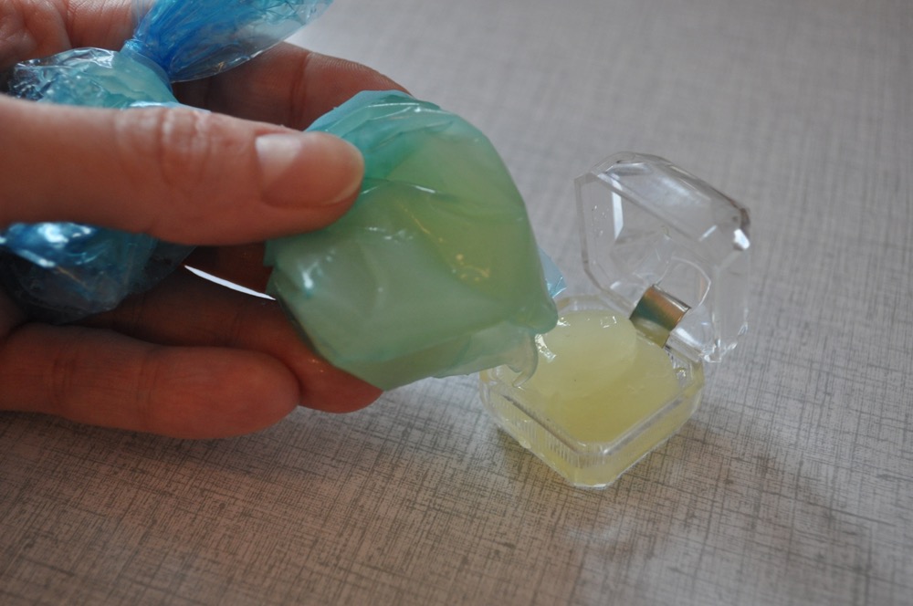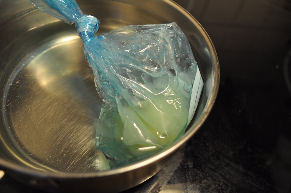 Det du så gjør er å ta så mye vaselin du trenger for å fylle eska du har valgt, og gjerne enda litt mer, og ha det i en pose sammen med essensen du har valgt. Legg deretter posen i varmt vann så vaselinen smelter. Bare pass på at posen er tett!