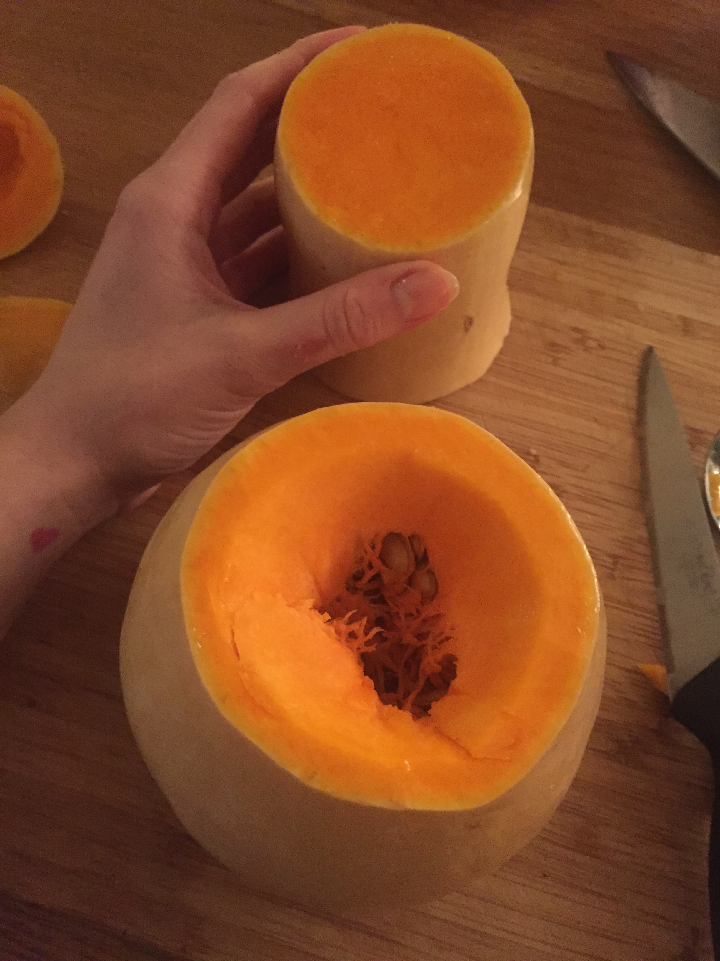 Jeg ante ingenting om denne typen gresskar før jeg satte kniven i det, men skjønte fort at den smaleste delen bør være rimelig moden før man kan hule den ut med skje. Og det var den ikke. Moden, altså. Så jeg droppet den smaleste delen og gikk til angrep på bunnen, som faktisk ser ganske lik ut innvendig som et vanlig gresskar.