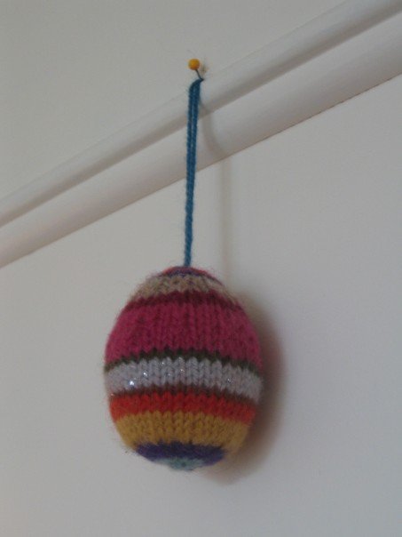 Dette egget ble strikket som et alternativ til eggemaling påsken 2006. Og tro det eller ei: eggeskallet er, såvidt jeg vet, fortsatt vel bevart og intakt på innsiden av alt restegarnet. Slå den, Arne & Carlos.