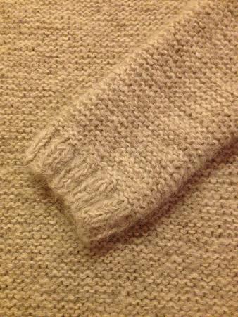Garnet jeg har brukt er Soft Silk Mohair fra Knitting for Olive i fargene Karamel og Råhvid. Og ja, hånda på neste bilde er min. Og ja, jeg har albue. Den har bare forsvunnet inni det enorme ermet.